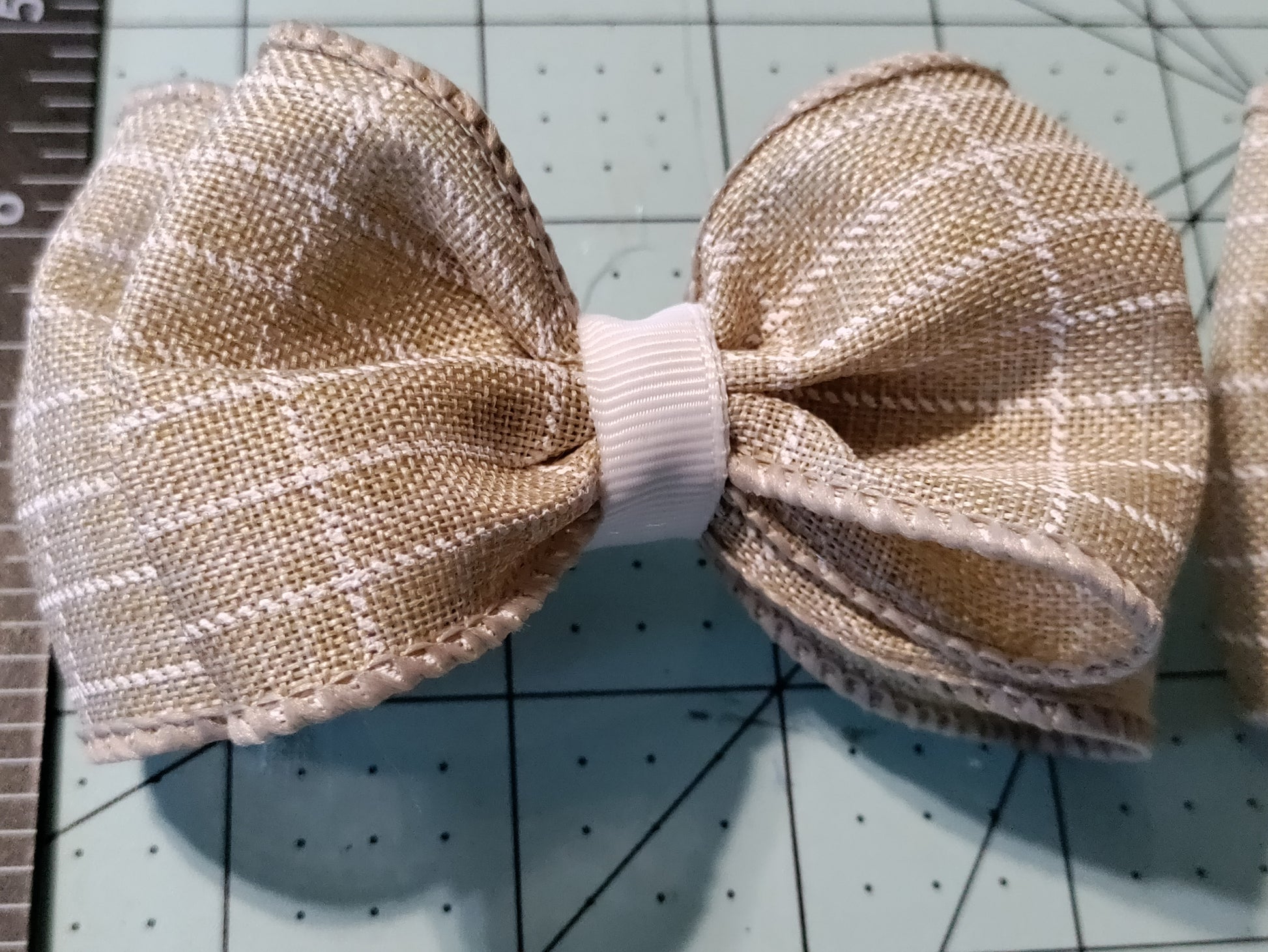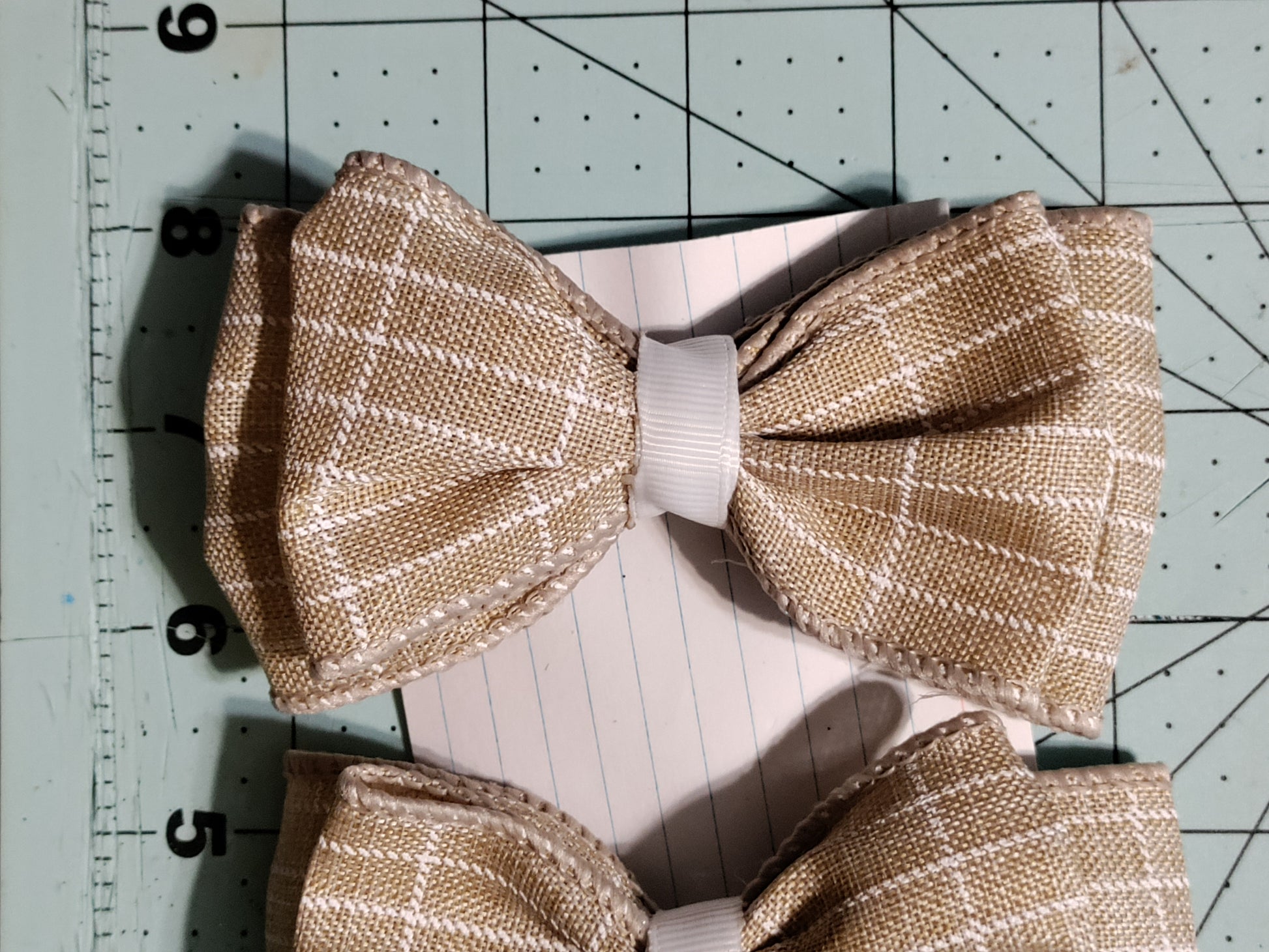 Hand-tied 2.5" Checkered Taupe and White Hair Bow. Handmade bow is a double bow with silver barrette on the back. Each one of our hair bows is handcrafted. They are made with great care, love, and attention to detail. If you have any issues with your bow please contact us and we will try our best to fix the issue.