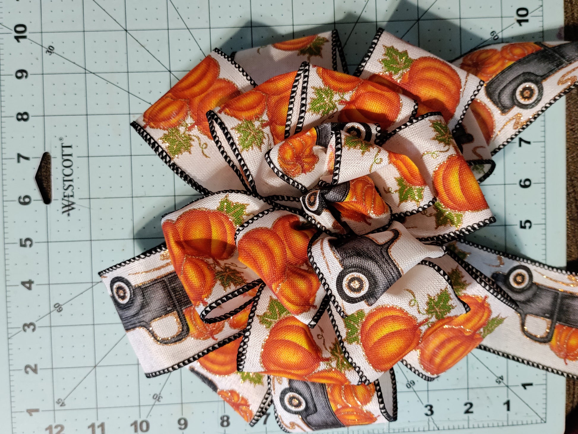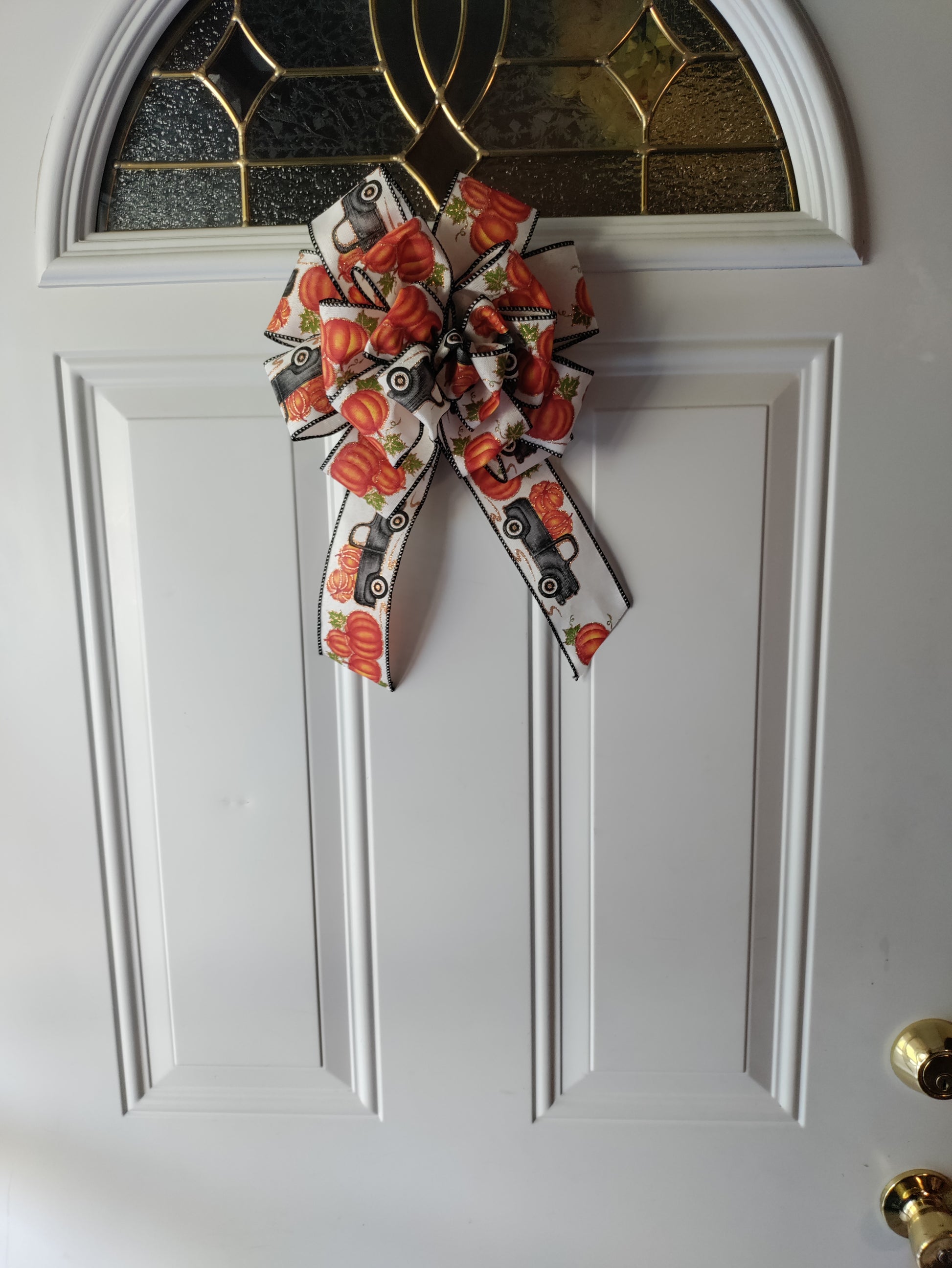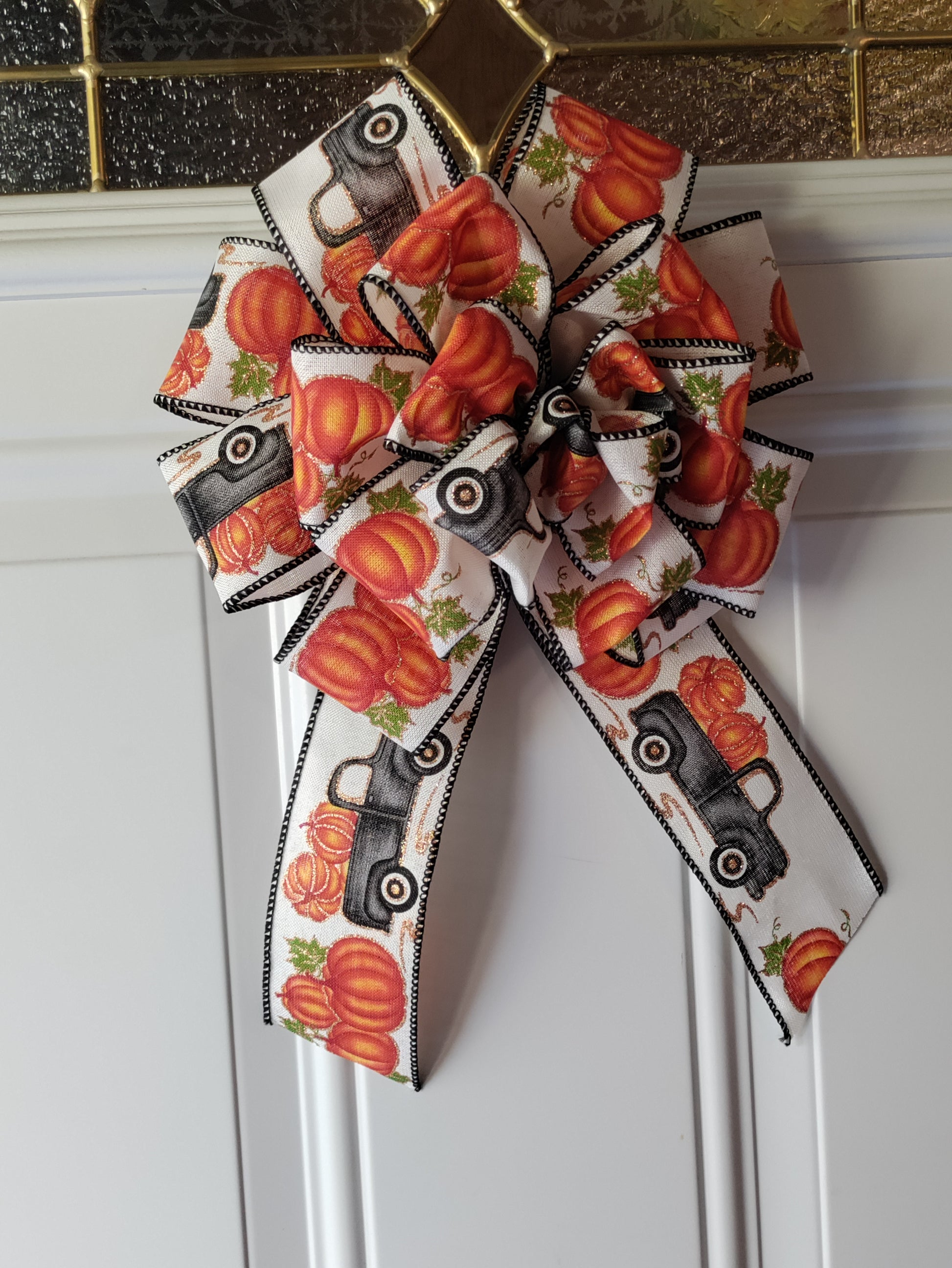 Hand-tied 2.5-inch Fall Black Truck and Pumpkins Bow with Tail. Each one of our bows is hand-made. They are made with great care, love, and attention to detail. If you have any issues with your bow please contact us and we will try our best to fix the issue.