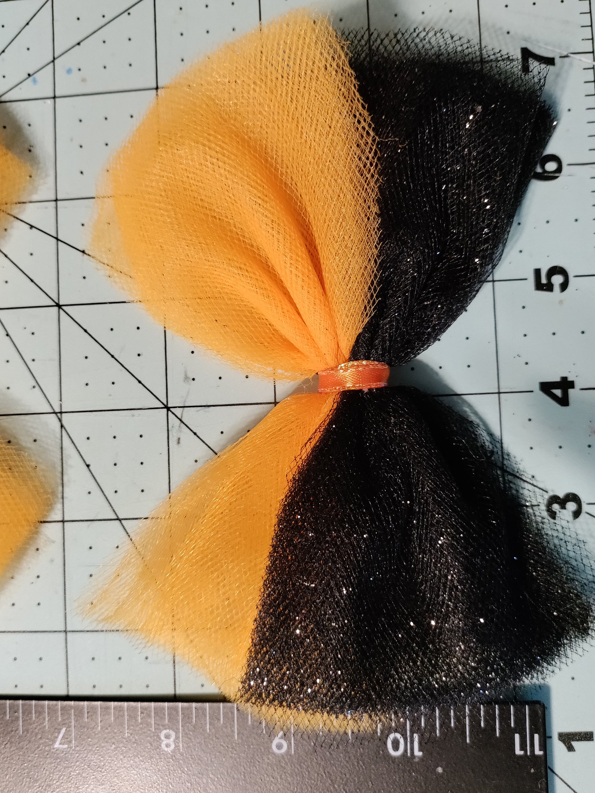 Orange and Black Glitter Tulle Hair Bow. The Tulle bow is black and orange with a double-prong clip in the back. Each one of our hair bows is handcrafted. They are made with great care, love, and attention to detail. If you have any issues with your bow please contact us and we will try our best to fix the issue.