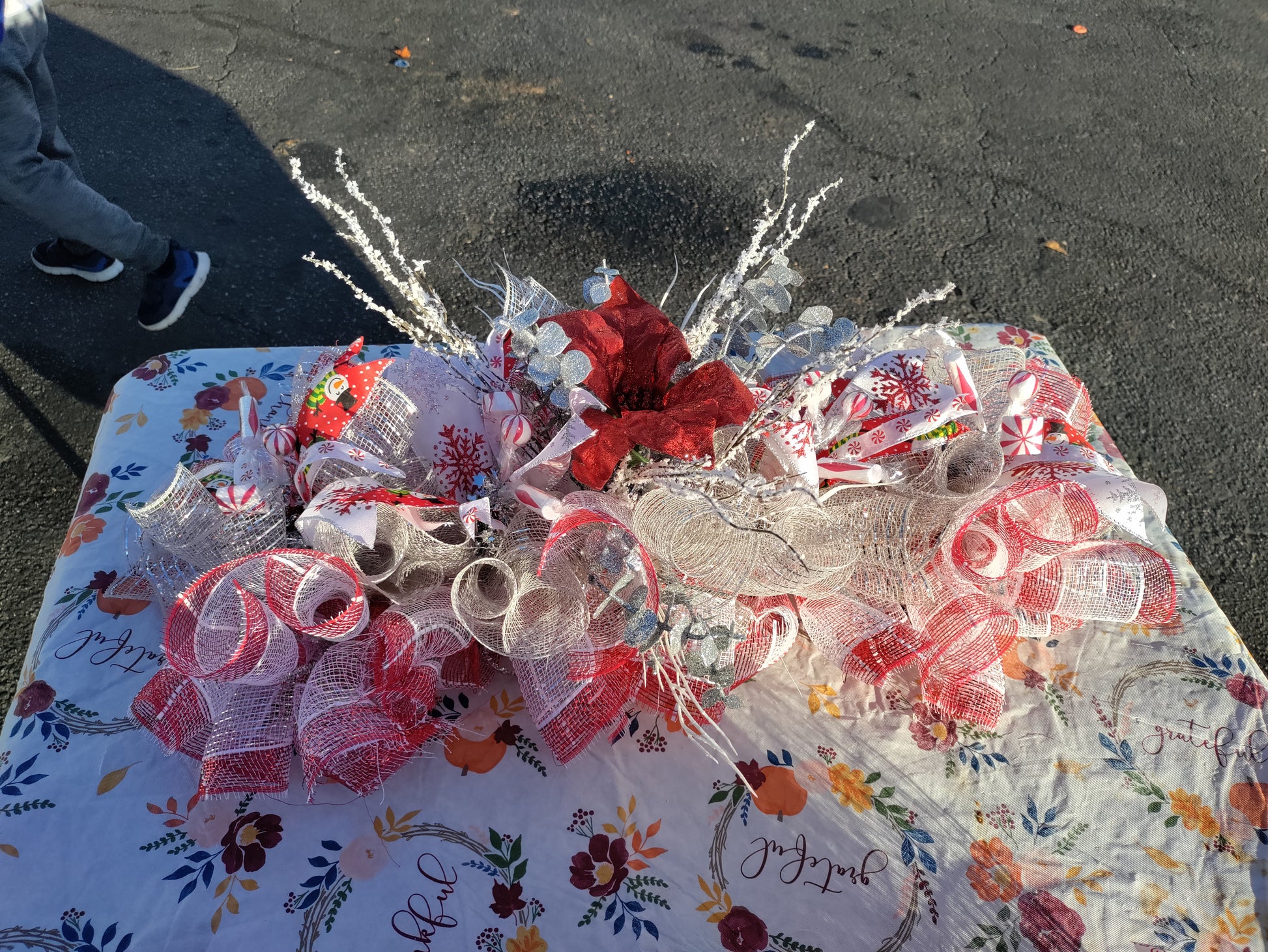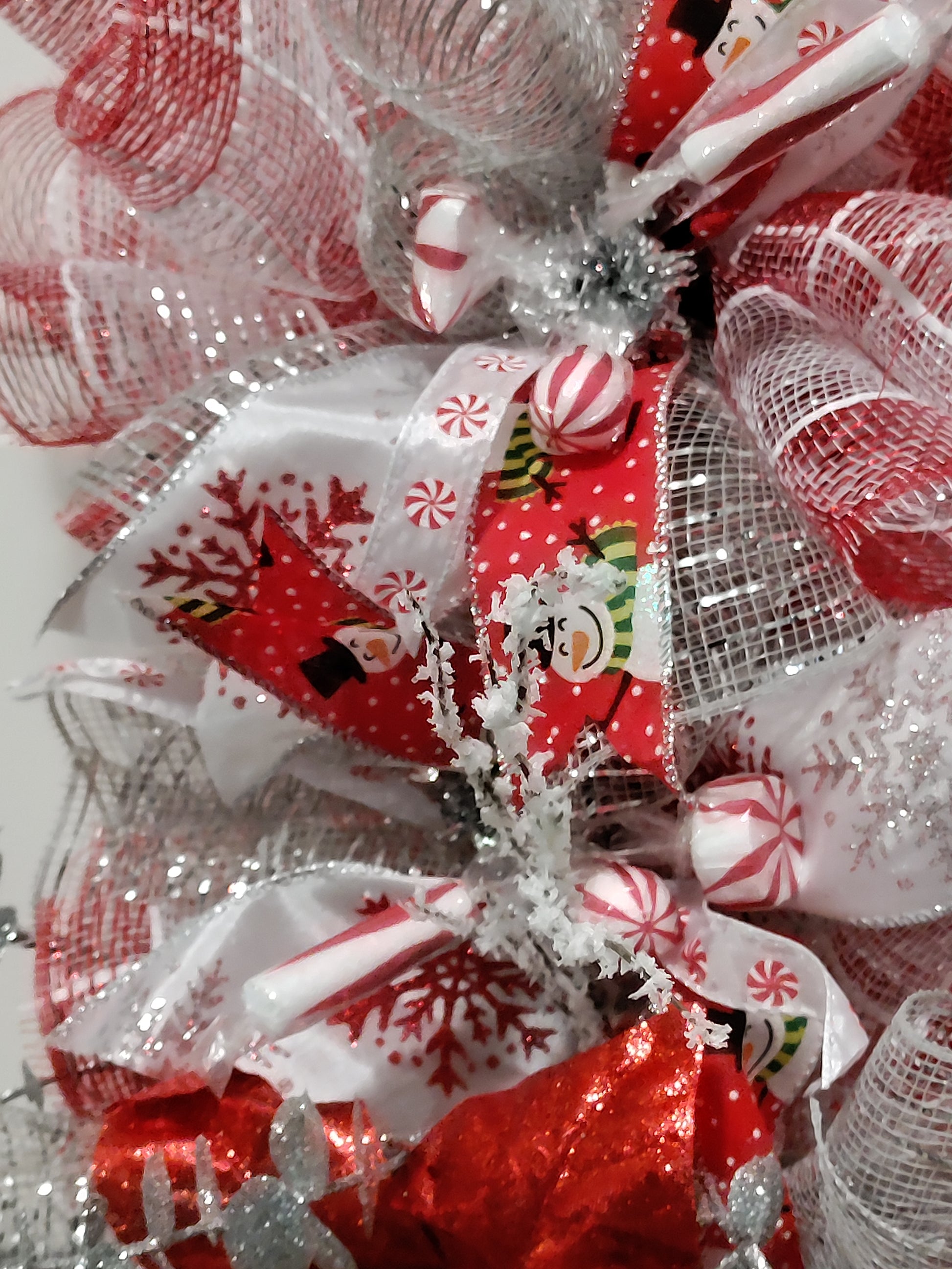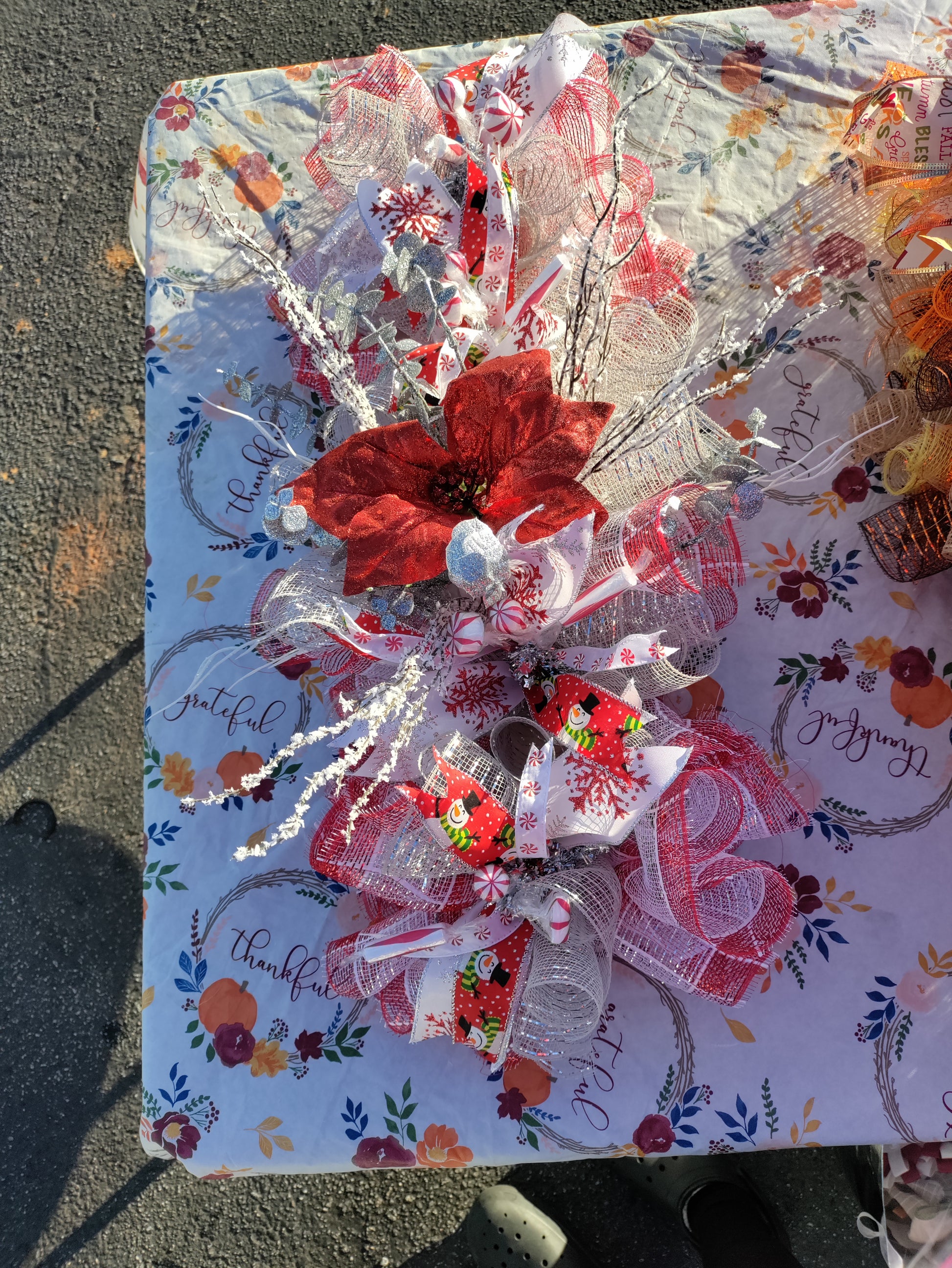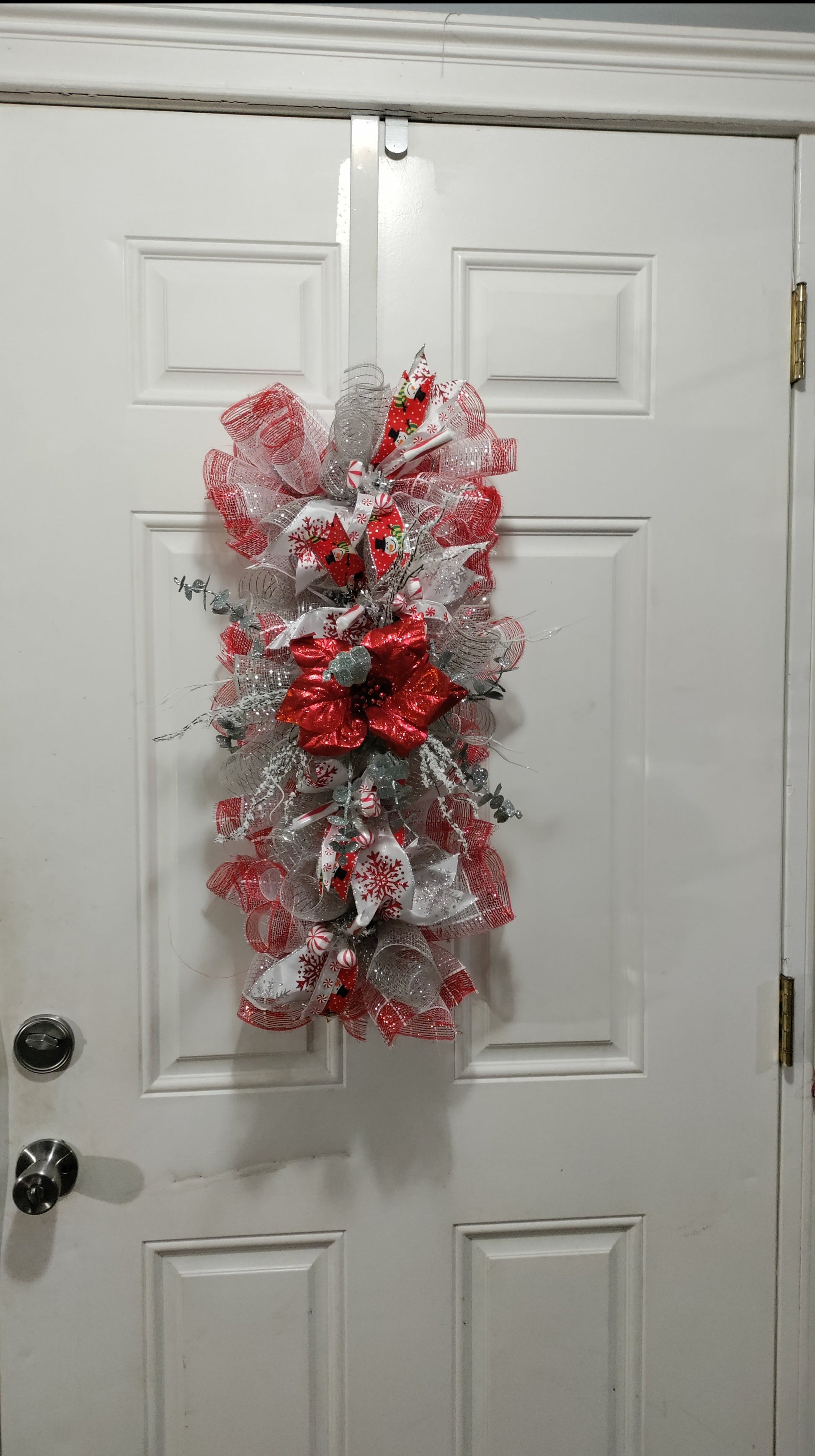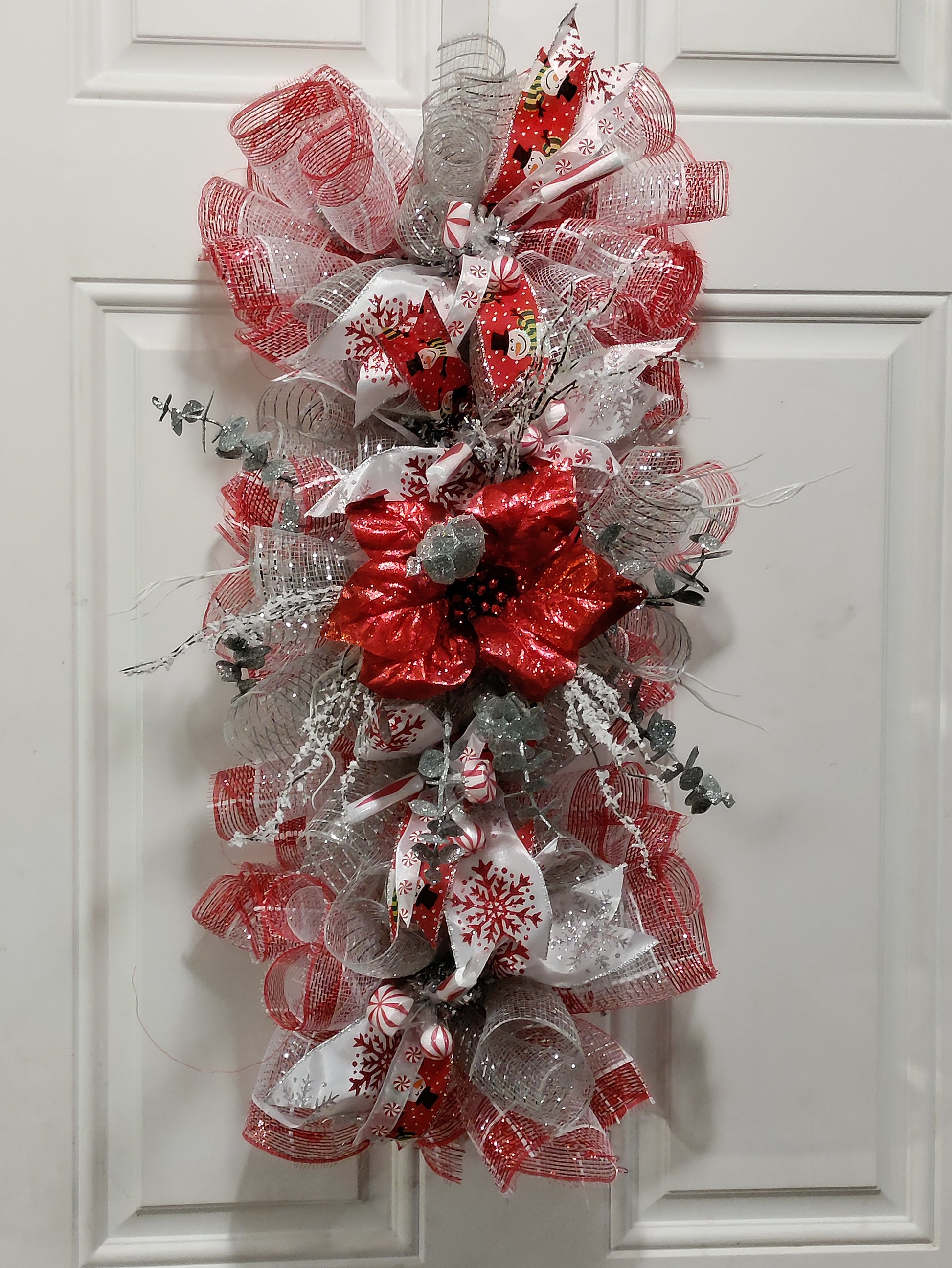 Red White and Silver Swag/Centerpiece. Red White and Silver Door Swag/Centerpiece. Elevate your decor with our handcrafted swags, which add a touch of warmth and sophistication to any setting. Each one of our swags is handcrafted. They are made with great care, love, and attention to detail. If you have any issues with your swag, don't hesitate to contact us; we will try our best to fix the issue.