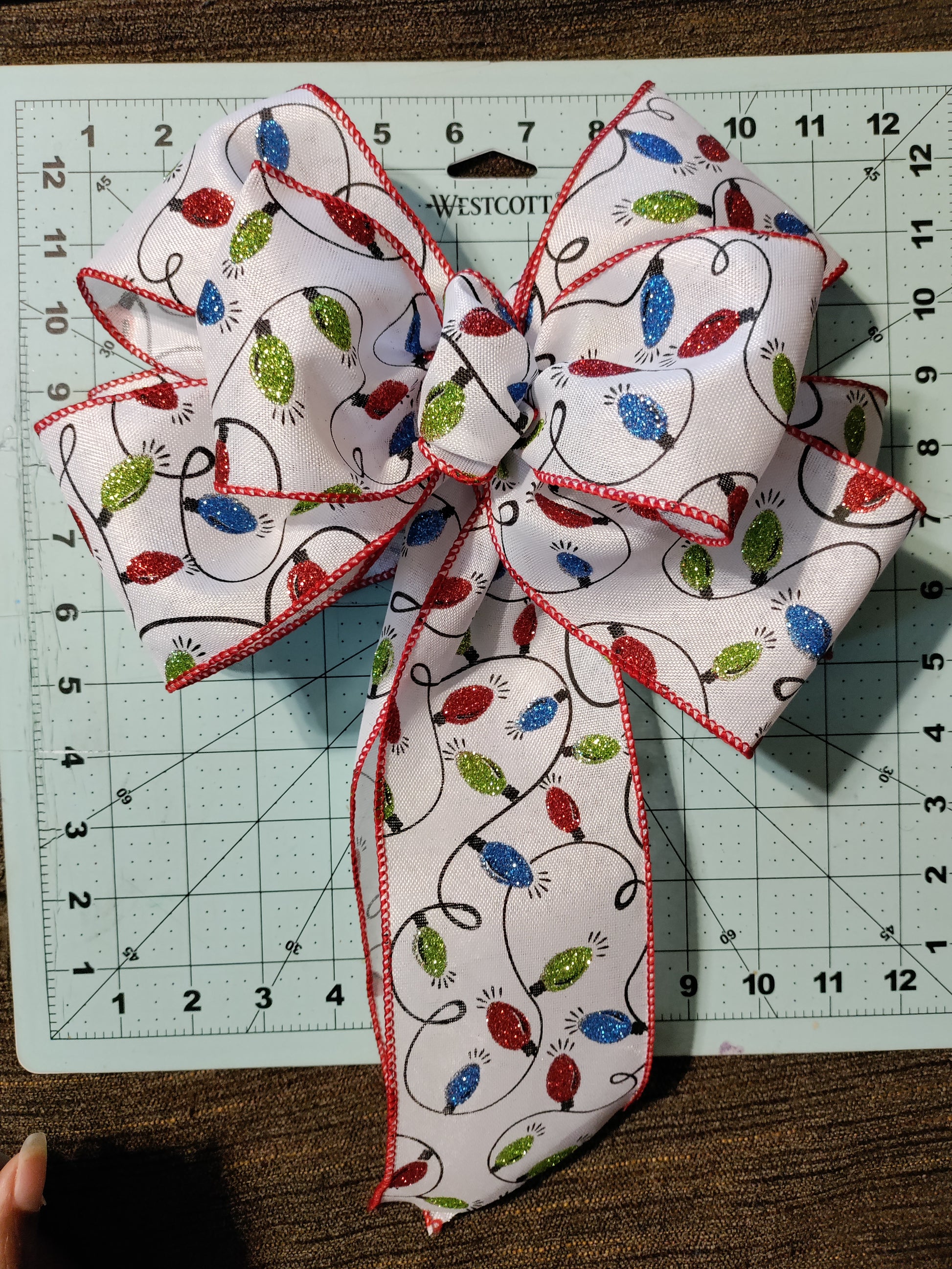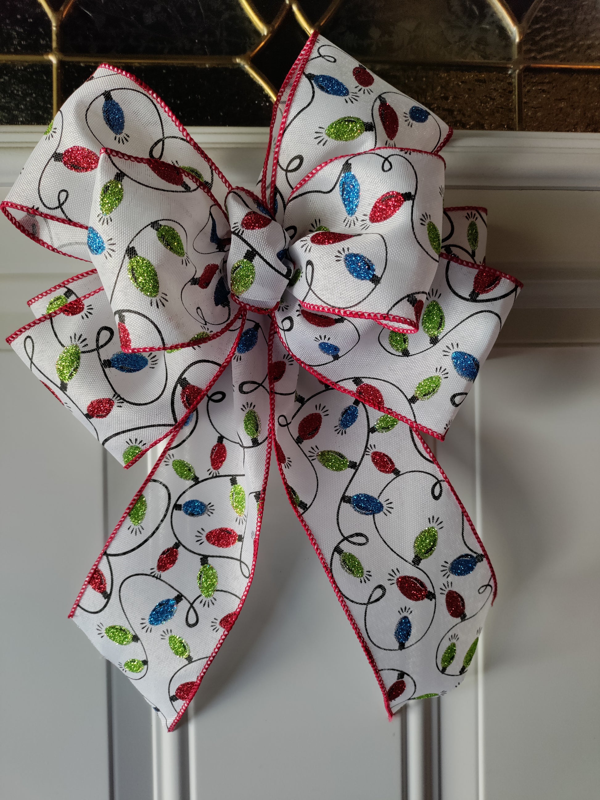 White Bow with Green, Red, and Blue Light Bulbs. Elevate your decor with our handcrafted bows, which add a touch of warmth and sophistication to any setting. Each one of our bows is hand-made. They are made with great care, love, and attention to detail. If you have any issues with your bow please contact us and we will try our best to fix the issue.