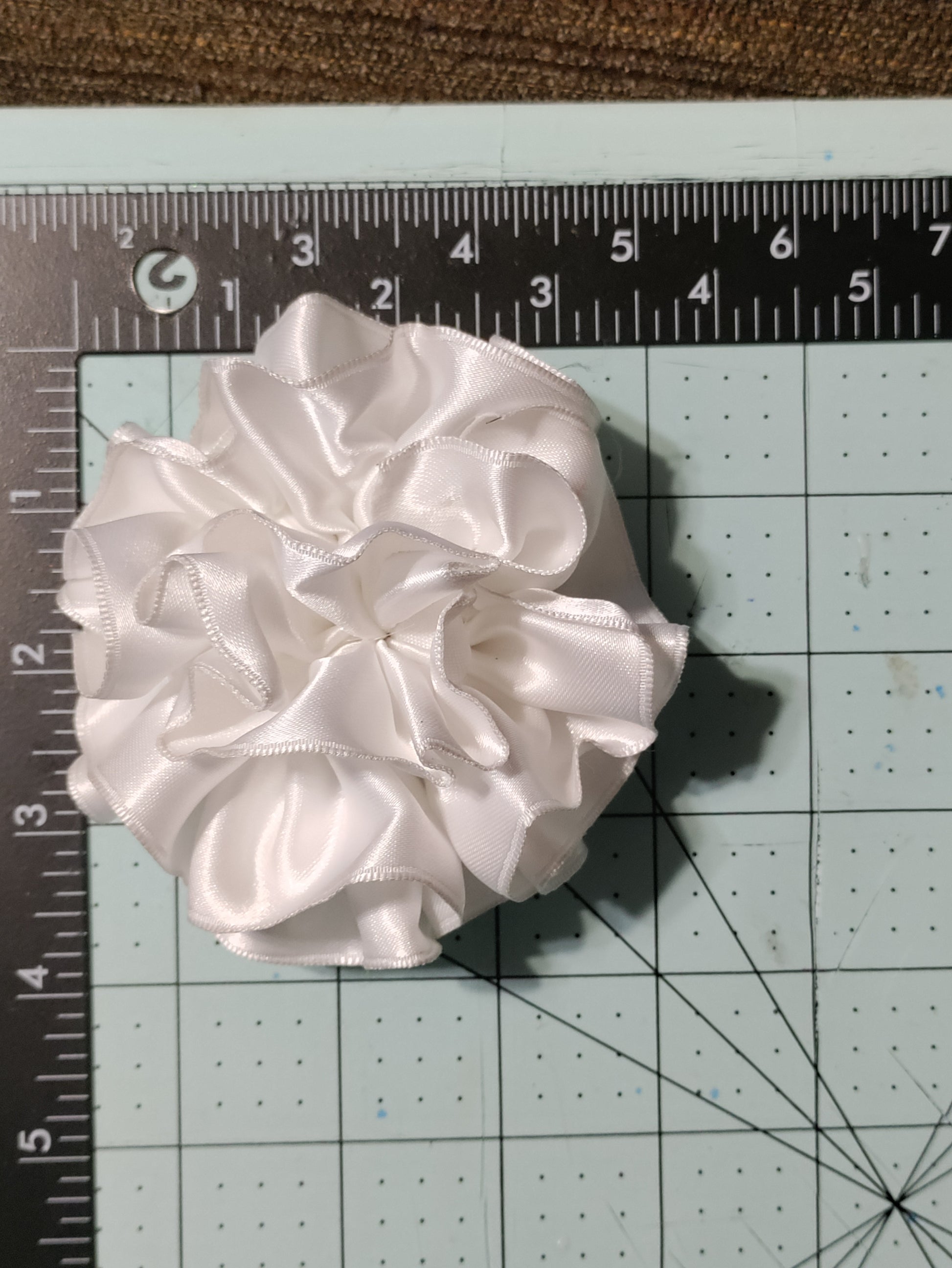 White Flower Hair Bow with white elastic ponytail holder on back. Each one of our hair bows is handcrafted. They are made with great care, love, and attention to detail. If you have any issues with your bow please contact us and we will try our best to fix the issue.